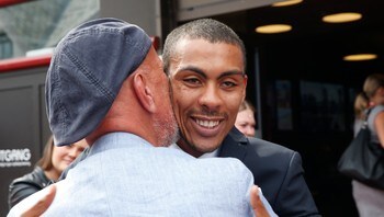 THE MAN BEHIND: Pøbelprosjektet was started by Eddi Eidsvåg, as here greets Jan Olav Sawyer under the Haugesund Film Festival Monday. Photo: Bendiksby, Terje / NTB scanpix